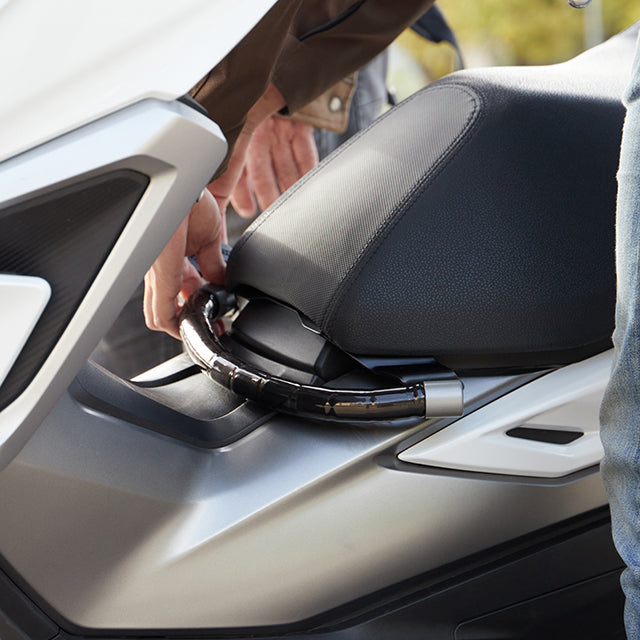 The lock rests in its mount under the seat and attaches to the handlebar to immobilize the vehicle.
