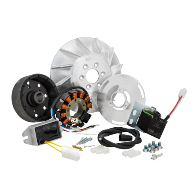 The stator features 8 coils to achieve sufficient power when the engine is idling. The blades are CNC machined to provide maximum airflow, and the flywheel is a single, perfectly balanced piece.