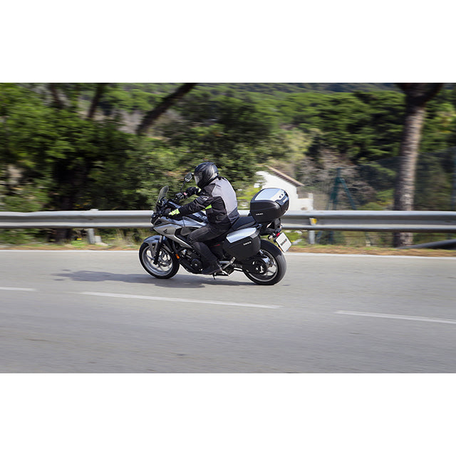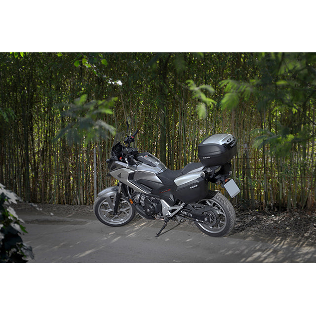 The SH40 alu look is a case made of high-quality reinforced polypropylene with enough capacity for a full-face helmet plus accessories, or two jet helmets. The trunk withstands extreme temperatures and protects the interior load both from impacts and falls as well as from precipitation in the form of rain and snow. The security provided by the Handle Lock System allows for a double lock; on one hand, it secures the case to the motorcycle and, on the other, it locks the trunk itself. It has a handle so that, once removed, transporting the case is easy and simple. It also features internal limiting straps that ensure the interior load does not move. Like all SHAD top cases, it opens and closes with one hand, without the need to use the key to open it. The key is only used when you want to lock it to the motorcycle. Its alu look finish design makes it ideal for both road and mountain use, and it matches perfectly with the SH23 Alu look. As optional accessories, we offer the backrest and the brake light. The backrest (D0RI60) provides greater comfort for the passenger as well as giving the set a completely unique design. The brake light (D0B40KL) is a low-consumption LED and is very easy to install, as it attaches to the lower part of the case base, increasing safety by making the motorcycle more visible from a rear view. Like the rest of SHAD motorcycle cases (except for TR48/TR37), it includes the plate and the screw kit.