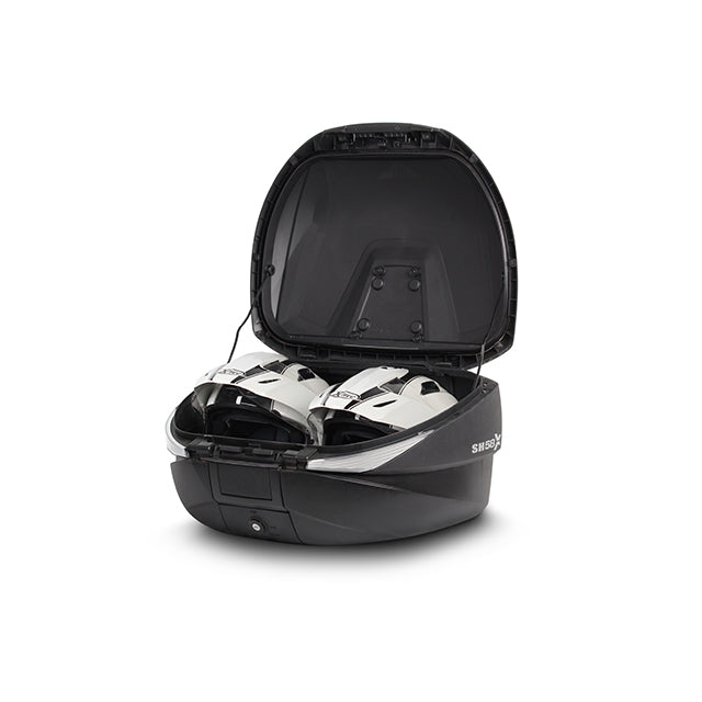 The eXpandable SH58X motorcycle case with carbon look finish, featuring adjustable volume in 3 positions (46-52 and 58 litres), has capacity for 2 enduro helmets without needing to lay them down, plus travel accessories. The cutting-edge technology and innovative design of the eXpandable case have earned it the prestigious Reddot Design Award 2017, a benchmark among designers and manufacturers. The only case on the market adjustable up to 58L, it is equally suited for daily city use as for those adventure trips you've always dreamed of taking. A very versatile case, which by switching between its different positions transforms from an aerodynamic case to a large trunk in just a few seconds. Its structural frame guarantees high rigidity and resistance with minimal weight, and it also features internal limiting straps to ensure the interior load does not move. It offers maximum security thanks to its innovative hermetic locking system “Smart Lock System”. This system allows you to keep the case open without being able to remove it, as well as to open and close it without the need for the key, so you only use the key to lock it. One-handed opening. The patented system that regulates the volume of the SH58X, allowing you to expand or reduce its size, makes it a highly functional and practical case, always adapting to the rider's needs: - Size L: offers a volume of 46L, perfect for carrying everyday items. - Size XL: at the second level it reaches 52L, very useful for those short weekend getaways. With capacity for two modular helmets. - Size XXL: the volume reaches 58L, enough to hold everything you need for that amazing adventure you've been dreaming of. With capacity for two enduro helmets. In addition, you can complement your case with accessories such as the brake light, the double backrest, or the also expandable inner bag. The backrest (D0RI80) has two pieces, made of two layers of polyurethane foam covered with synthetic leather in two textures, guaranteeing total comfort for the passenger. The expandable inner bag (X0IB10) with top opening and external pocket for direct accessibility, is reinforced with internal foam to protect the contents from any impact and has a strap and handle to make it easier to carry. In this way, the inner bag makes it easy to transport your belongings without having to remove the case. Finally, the brake light (D0B29KL) is LED, low consumption, and very easy to install, as it fits on the lower part of the case base. This increases safety by making the motorcycle more visible from the rear. If you like asphalt and Sport Touring is your thing, the SH58X is your case. Its sophisticated carbon look, matching the SH36 side cases with carbon look finish, exudes modernity and sophistication. If you are someone who takes design a step further, you will like being able to choose from the different available lid colours: white, metallic black, and new titanium, or the blank option so you can customise it to your liking. Like the rest of SHAD motorcycle cases (except TR48/TR37), it includes the mounting plate and screw kit.