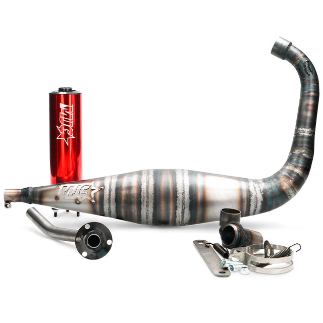 Ce échappement pour moteurs Derbi et Minarelli AM6 est conçu pour offrir des performances supérieures aussi bien sur motos d’origine que sur préparations 50cc et 70cc. Fabriqué avec des matériaux de haute qualité et des techniques artisanales, il constitue le choix idéal pour ceux qui recherchent un gain de puissance et de réactivité moteur, sans négliger le son ni l’esthétique.