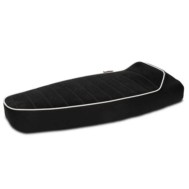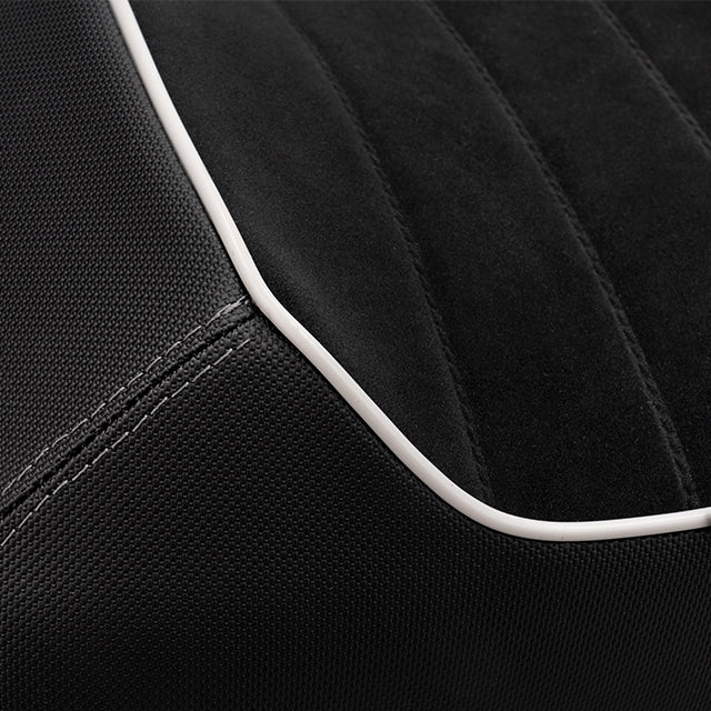 Revêtue d’un similicuir type alcantara, avec un motif de rayures réalisé par des surpiqûres ton sur ton et un liseré gris fin, cette selle affiche un style très sportif.