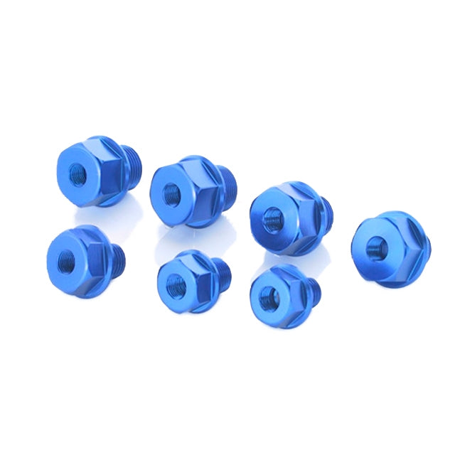 Vis adaptateur pour capteurs de température avec filetage PT1/8x28 anodisé en bleu.