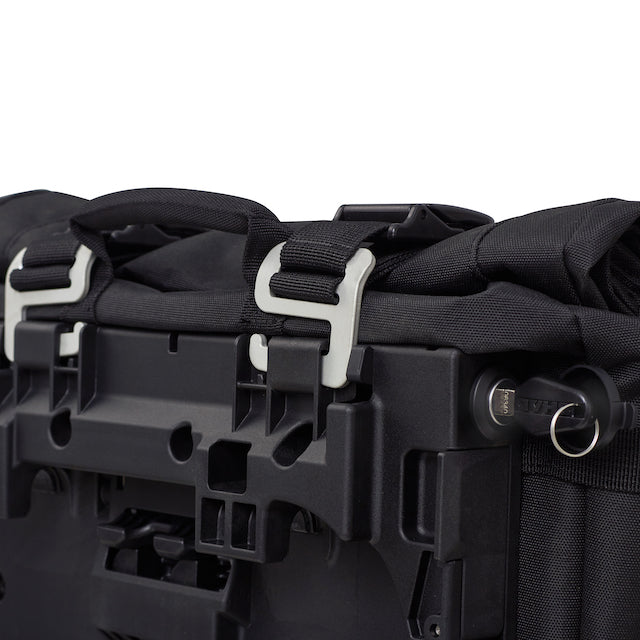 El conjunto de bolsas laterales cuenta con 6 hebillas DURAFLEX para ajustar la bolsa al tamaño de la carga y mejorar la estabilidad en conducción. Además, todas las correas incluyen cierres en sus extremos para evitar cabos sueltos. También cuenta con elementos reflectantes para aumentar la visibilidad y asas de transporte acolchadas.