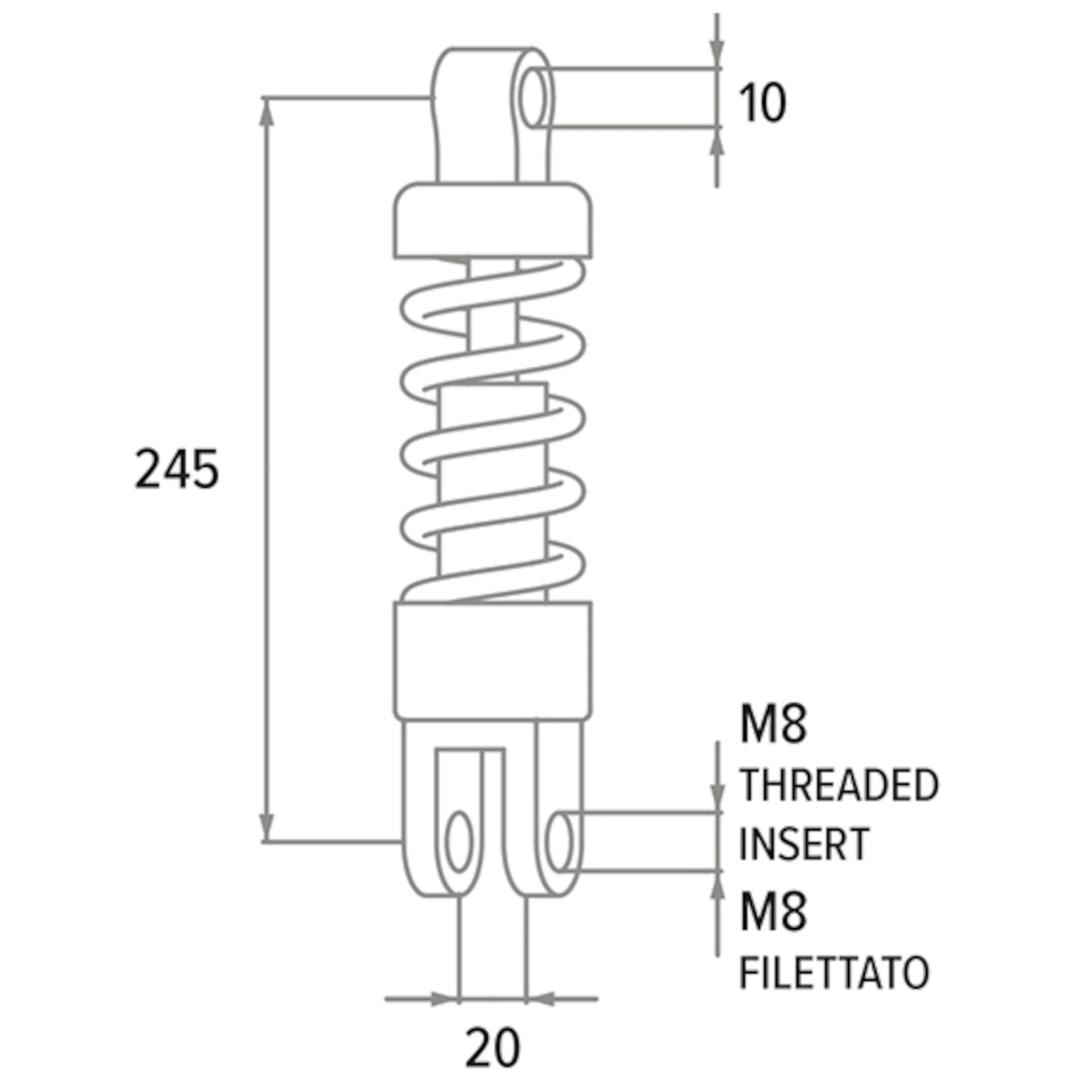 - Anclaje inferior: Horquilla de 20 mm de ancho con inserto roscado M8 (M8 filettato).