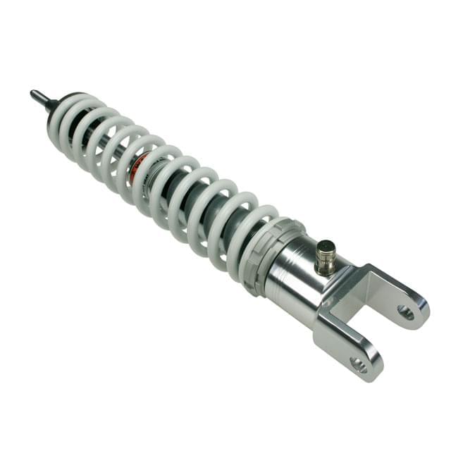 Amortiguador fresado de gas a presión de CNC, con una imagen muy lograda. La supensión llenada con aceite y nitrógeno, y la tensión inicial del muelle contínua y regulable por una tuerca estriada de aluminio son algunas de las ventajas clásicas que ofrece un tubo amortiguador Sport. Este amortiguador, además, aguanta sin problema las sacudidas más fuertes. Disponible en color blanco neutro, combinable con el color de todas las motos, a un precio exclusivo. Calidad del fabricante italiano Motoforce.