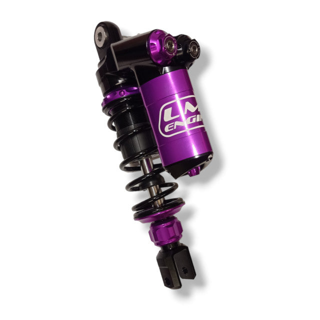 Amortiguador para scooters con motor Minarelli, deportivos y de competición. Diseñado y fabricado con sistemas computarizados utilizando materiales de alto rendimiento técnico-mecánico y procesos de alta precisión con el objetivo de reducir pesos y fricciones, para mejorar la suavidad, estabilidad a altas temperaturas y precisión de ajuste para garantizar al piloto la máxima sensibilidad de conducción (la diferencia de amortiguación es perceptible en cada clic de ajuste hidráulico) y excelente estabilidad del eje trasero. Todo esto sin descuidar el "look" LMR.
