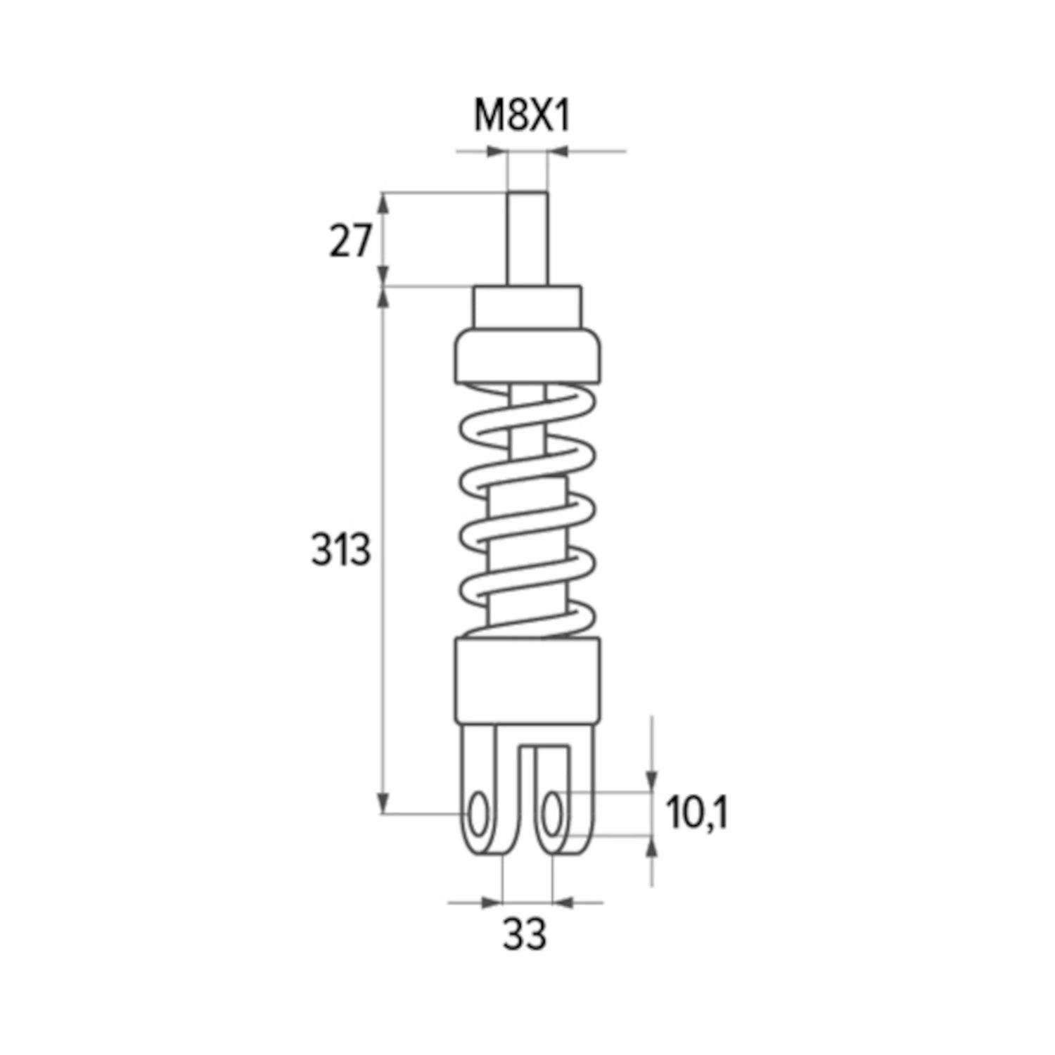 - Anclaje inferior: Horquilla de 33 mm de ancho con paso para tornillo de 10,1 mm.