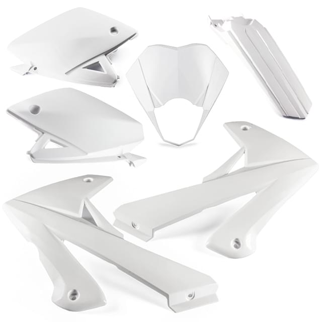 Un kit completo de seis plásticos para modelos Rieju MRT 50 y Rieju Marathon 50. Kit de color blanco, sin pegatinas.