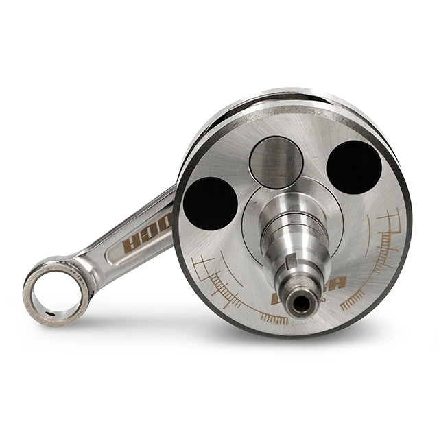 Fabricado con material de alta calidad, contrapesado con tacos de aluminio para reducir su peso y aumentar el rendimiento. Este cigueñal nos ofrece la dureza necesaria para preparaciones de gama alta, a demás su diseño cerrado nos garantiza un aumento de pre compresión en el cárter.