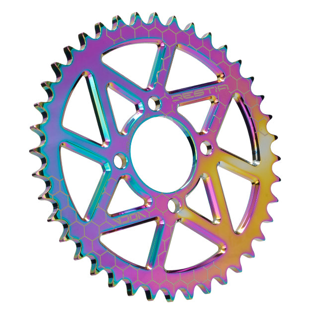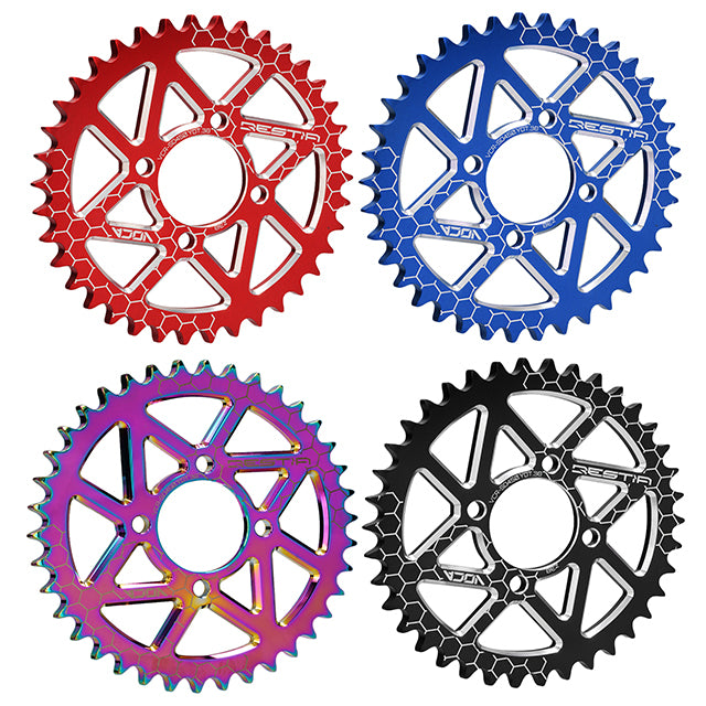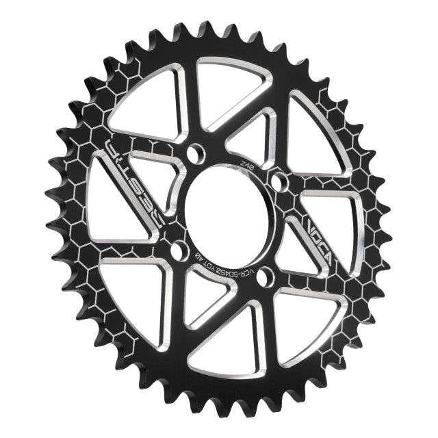 La estructura monobloque de la corona VOCA, sin uniones ni soldaduras, asegura una integridad estructural superior, optimizando la transferencia de potencia desde el motor hacia la rueda trasera con mínimas pérdidas de energía. La variedad de acabados en colores permite una personalización visual, alineada con las preferencias estéticas del piloto y el esquema de colores de la motocicleta, sin comprometer la integridad funcional del componente.