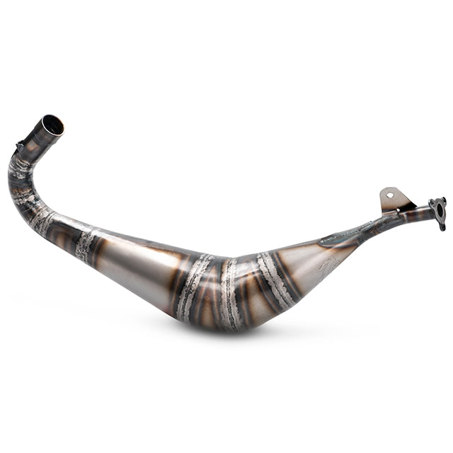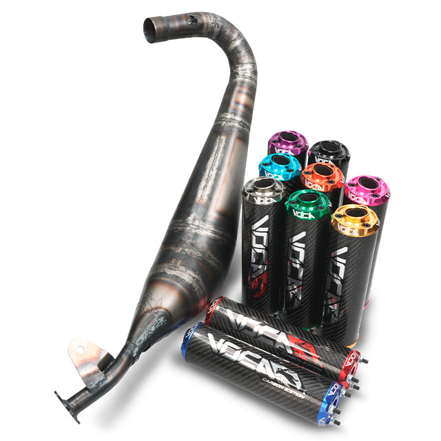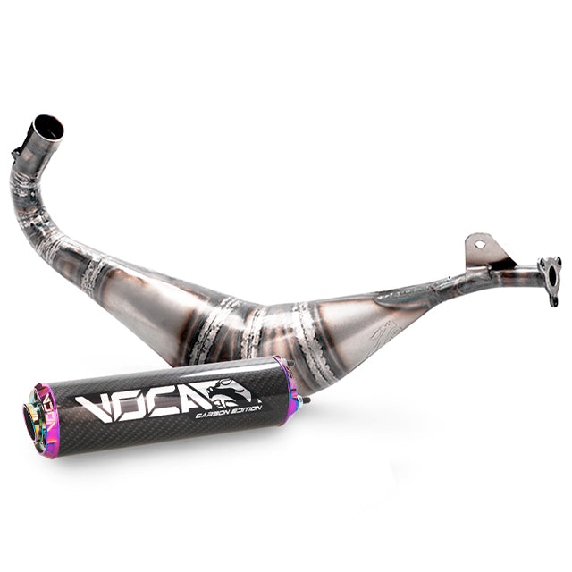 Destaca por un cuerpo voluminoso, fabricado de manera artesanal en chapa de 0.8mm, adaptable a los cilindros VOCA bigbore e Italkit 100cc, por otro lado, se ha conseguido llevar el escape hasta su extremo llegando a las 13.000RPM, se ha desarrollado en banco de pruebas y testeado en calle obteniendo una mayor velocidad final y modificando toda la curva de potencia.