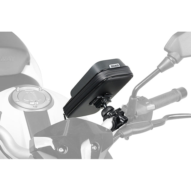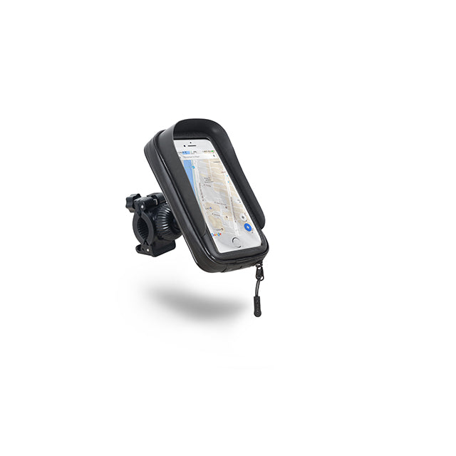 Soporte impermeable para smartphones válido para todas las motocicletas. Según la versión escogida, el soporte puede fijarse al manillar o al retrovisor, de forma sencilla y rápida, gracias a su fijación ajustable.