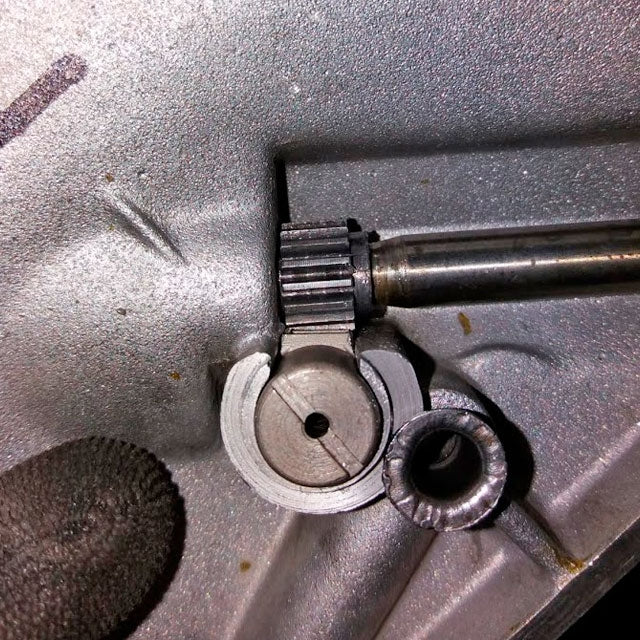 Na última imagem, vê-se como pode ficar montado em algumas tampas; desta forma, não funciona corretamente. A solução é recuar um pouco a posição do casquilho e limar o alojamento do empurrador até que fique completamente paralelo com a haste.