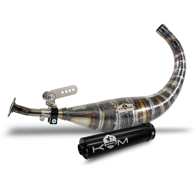 Os escapes KRM são fornecidos sem silenciadores para que possas escolher a cor que melhor se adapta à tua mota. No entanto, para obter a máxima potência, é imprescindível utilizar um silenciador KRM 70-90cc, a partir do qual a marca desenvolveu o escape.