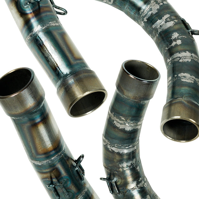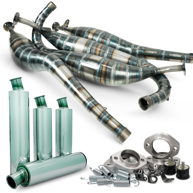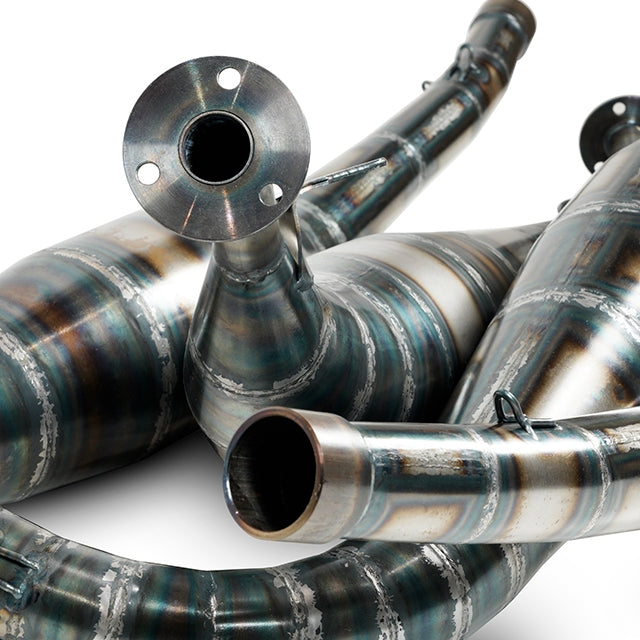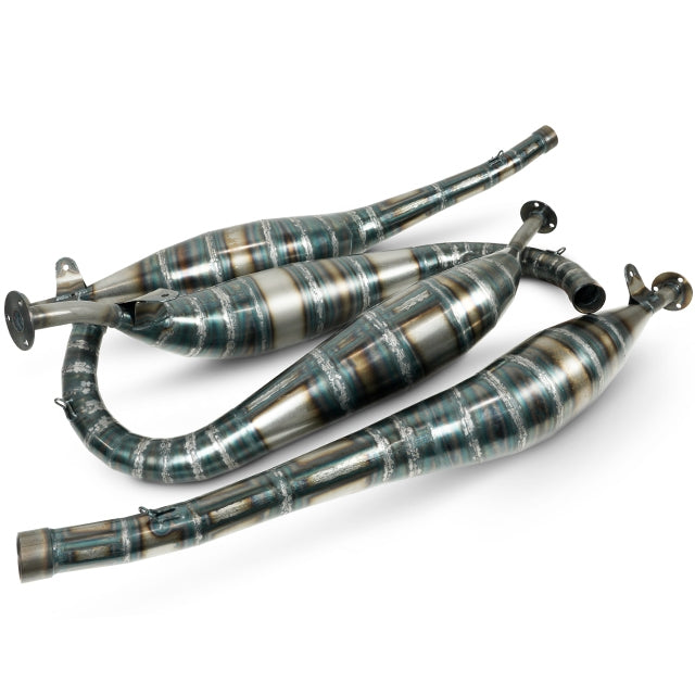 Com este sistema de escape de apenas 14kg é possível alcançar uma maior leveza. Até à data, é o sistema de escapes mais vendido para os modelos Suzuki RG500 e RG400, com soldadura dos cones feita manualmente, um a um.