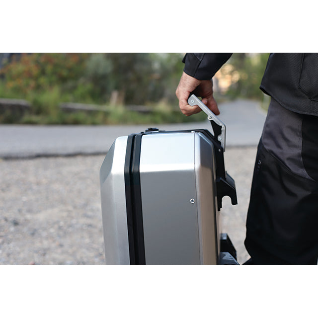 Maleta lateral com design estrutural aerodinâmico, fabricada em liga de alumínio endurecido.
